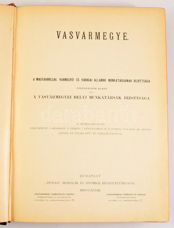 Vasvármegye. Szerk.: Dr. Sziklay János - Dr. Borovszky Samu. Magyarország vármegyéi és városai. Magyarország monográfiája. Bp., 1898, Apollo Irodalmi Társaság, XI+622 p. 31 műmelléklettel, ezek között 5 színeskép, 3 tárkép, 7 énnyomat, 16 autotipia, továbbá 458 szövegképpel és teljes név- és tárgymutatóval. Oldalszámozáson kívül fekete-fehér és színes képtáblákkal, kihajtható térképekkel. Kiadói aranyozott, festett, dombornyomásos egészvászon-kötésben, Leszik-kötés, gerincen kicsi sérüléssel.