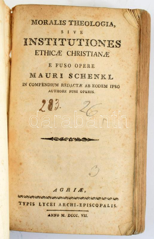 Schenkl Maurus: Moralis theologia, sive institutiones ethicae christianae e fuso opere. Agriae, 1807, Typis Lycei Archi-Episcopalis, XVI+616 p. Latin nyelven. Kiadói papírkötés, foltos lapokkal, deformált gerinccel, kopott, kissé foltos borítóval, kis szamárfülekkel az utolsó néhány lapon.