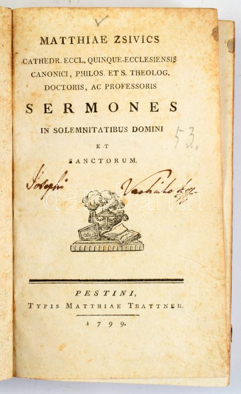 [Zsivics Mátyás (1751-1814)] Matthiae Zsivics: Sermones in solemnitatibus Domini et sanctorum. Pestini, 1799, Typis Matthiae Trattner, 4 sztl. lev.+ 387 p. Latin nyelven. Kartonált papírkötésben, kopott borítóval, sérült gerinccel, foltos lapokkal, néhány lapon szamárfüllel (292-319), possessori bejegyzéssel.