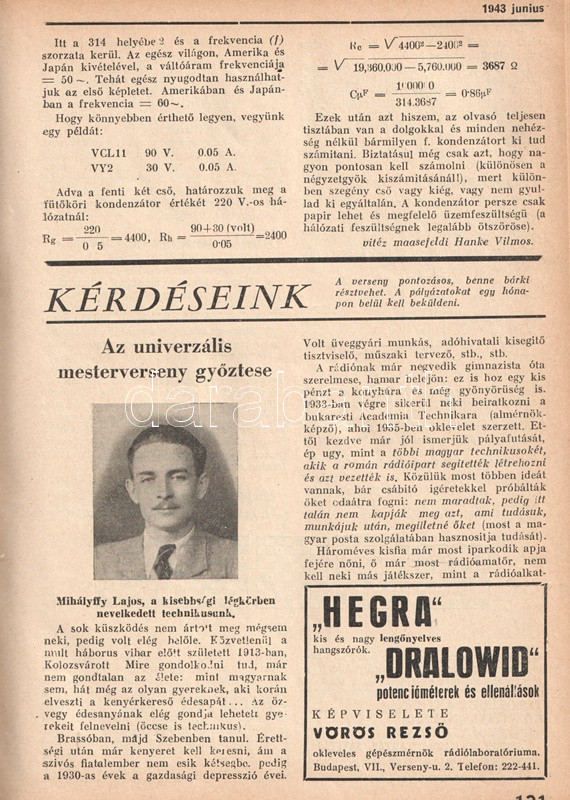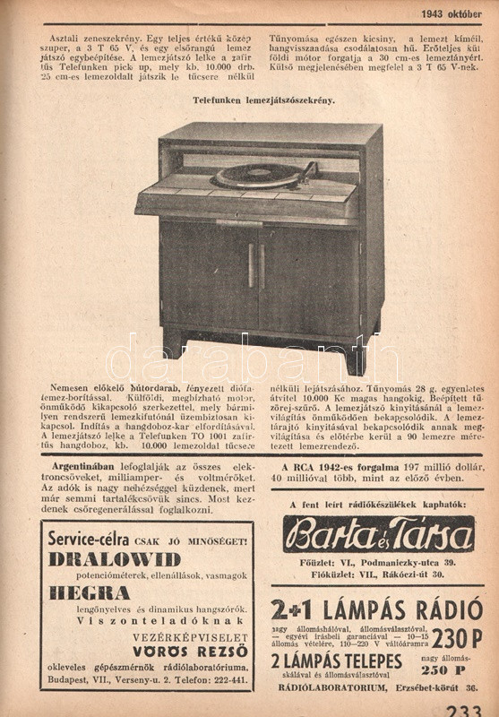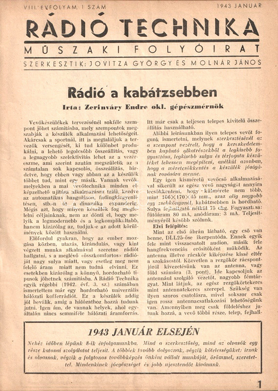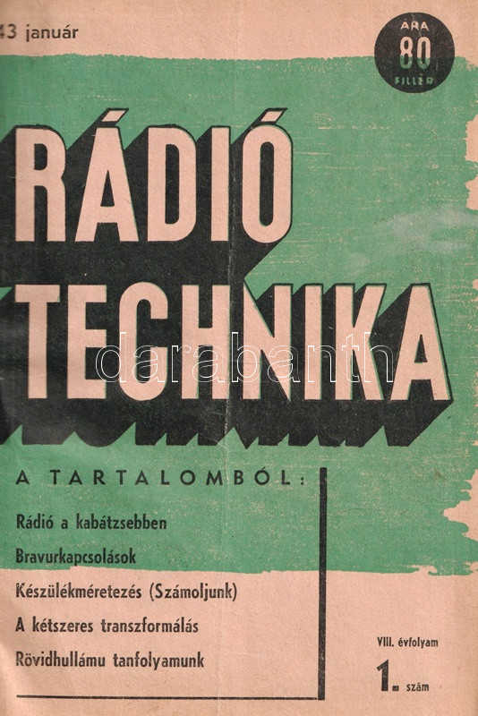 [Folyóirat] Rádió Technika. Műszaki folyóirat. Szerkesztik Jovitza György és Molnár János. VIII. évfolyam, 1-12. szám. (1943. január - 1943. december). [Teljes évfolyam, egybekötve.]