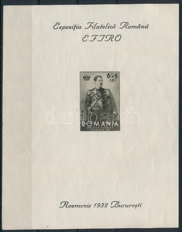 Románia 1932 EFIRO blokk Mi 1, eltolódott vágással, bal oldalon 43, jobb oldalon 33 mm kerettel (Mi EUR 100.-++) (pici ráncok / small creases)