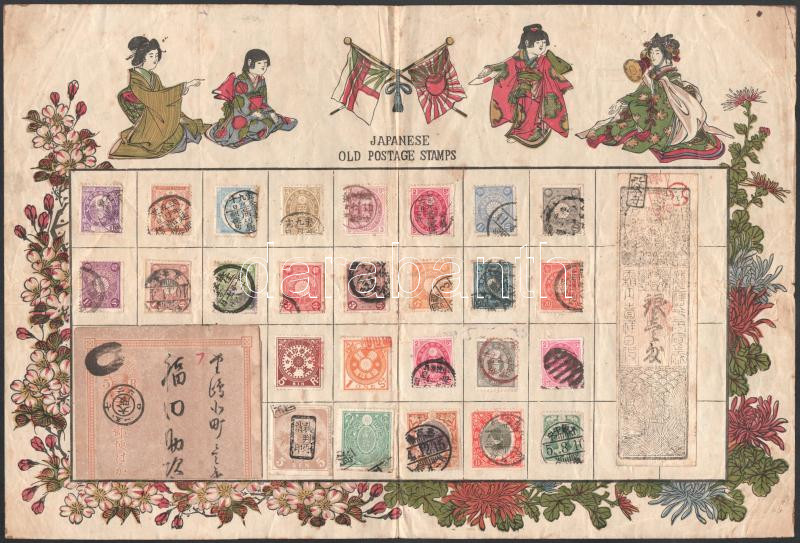 Japán klasszikus bélyegek és 2 db levelezőlap díszes lapon / Japanese classic stamps and postcards