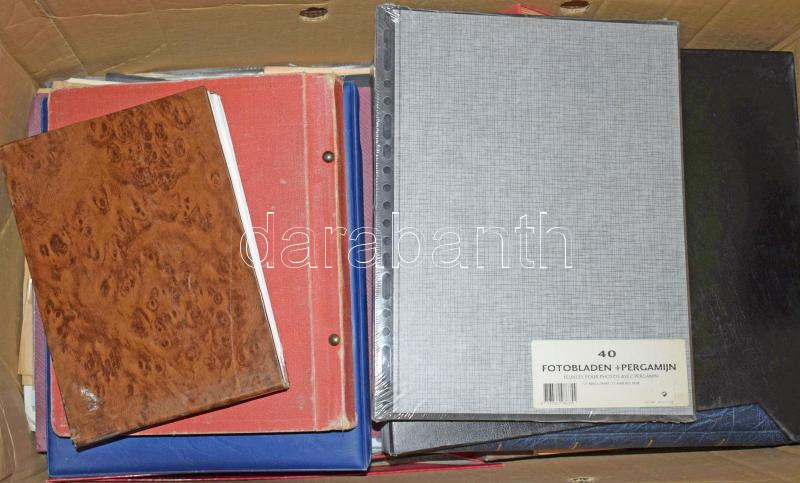Vegyes kellék tétel, benne üres kis-, közepes- és nagy berakók, albumok, albumlapok, kiadványok, dossziék, javarészt használt állapotban, nagy karton dobozban
