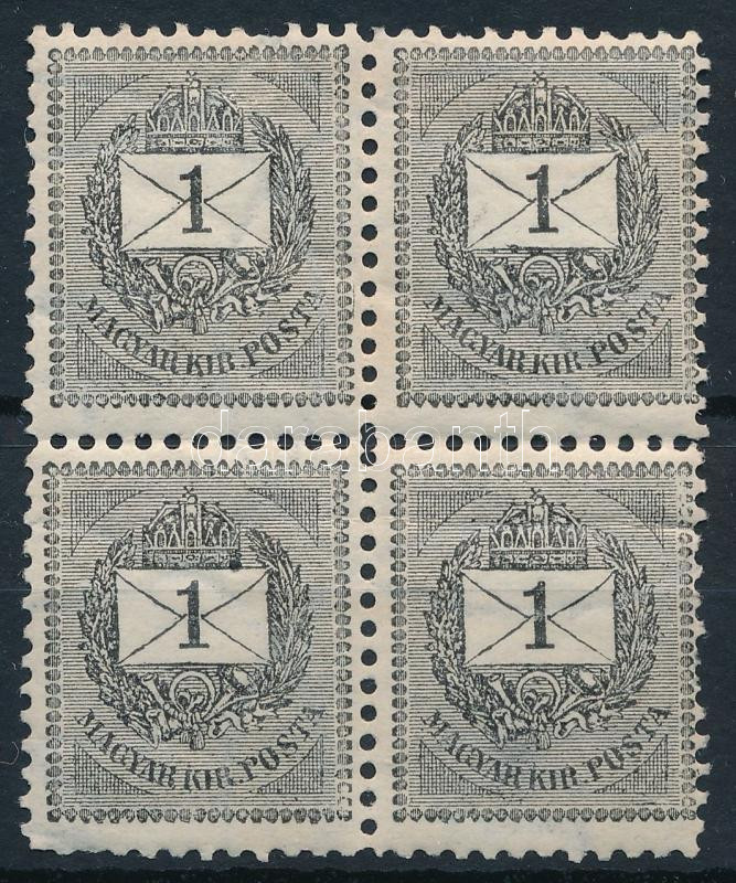 1889 1kr négyestömb 11 1/2 fogazással (ráncok, szakadás / creases, torn)