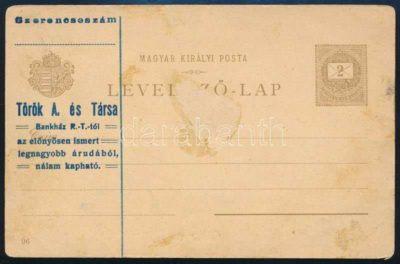 1896 Millenniumi díjjegyes levelezőlap Török A. és Társa felülnyomással (nagy horzsolás nyom)