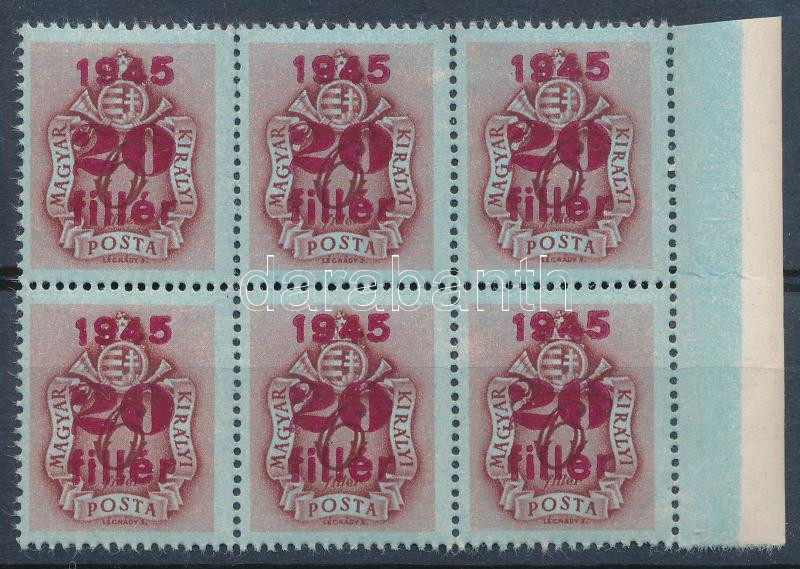 1945 Kisegítő portó 20f/6f ívszéli hatostömb (27.000)