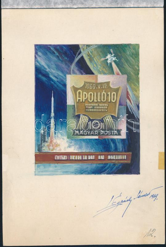 1969 Légrády Sándor Apollo-10 bélyegterve a tervező aláírásával. Képméret: 90 x 112 mm