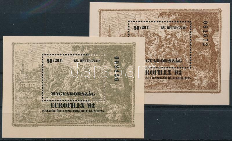 1992 Bélyegnap (65.) Eurofilex blokk eltérő színárnyalatban ragasztónyom nélkül, nincs felragasztva + sima blokk (21.000)