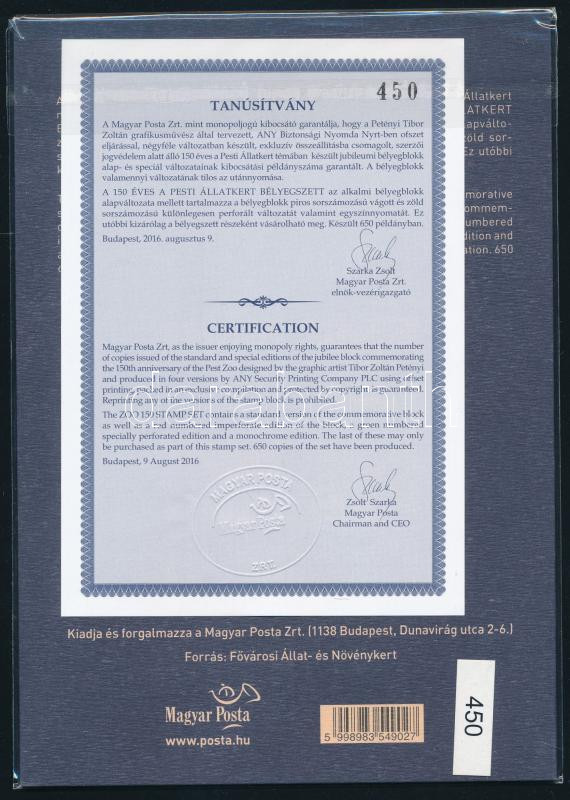 2016 150 éves a pesti állatkert bélyegszett eredeti csomagolásban (73.000)