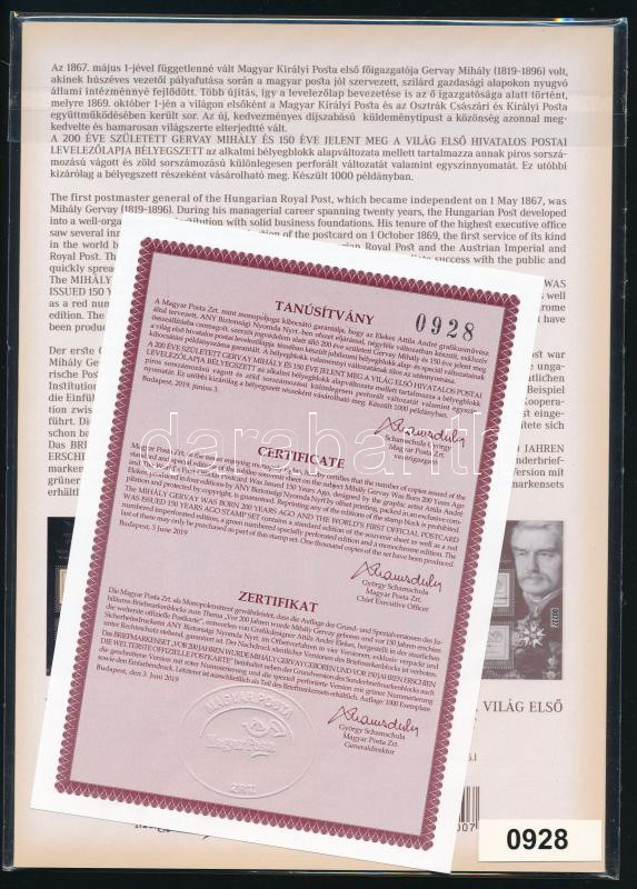 2019 200 éve született Gervay Mihály - 150 éve jelent meg a világ első hivatalos postai levelezőlapja bélyegszett, tanúsítvánnyal, 0928-es sorszámmal (47.000)