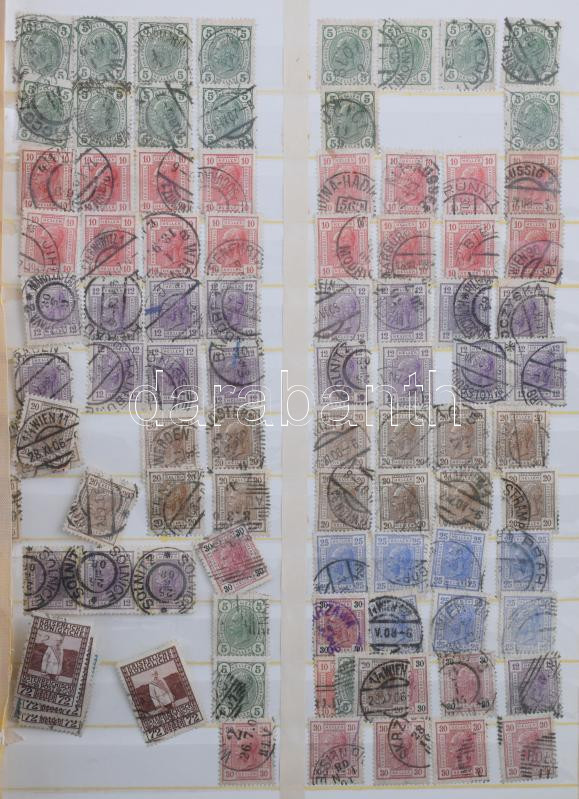 Magyar és osztrák klasszikus anyag, benne 501 db Turul bélyeg + 1.316 db osztrák bélyeg az 1890-1908 közötti időszakból, 13 lapos nagyalakú berakóban