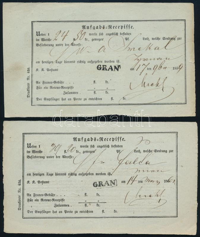 1859-1861 2 db feladóvevény "GRAN" (Gudlin 800 p), luxus minőség