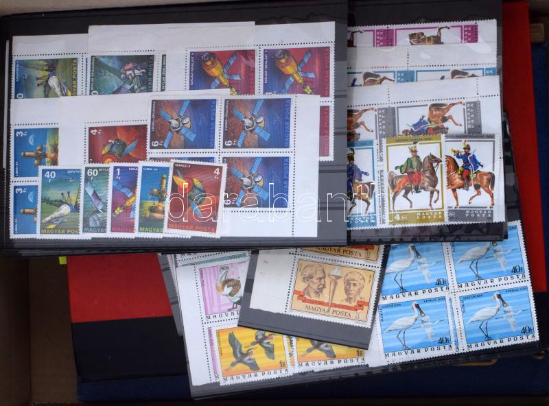 Magyar anyag 1 db berakóban, berakólapokon és stecklapokon, blokkok, összefüggések, kisívek, javarészt az 1970-1980-as évekből. Több bélyeg sérült, rozsdás, betapadt / damages, stain