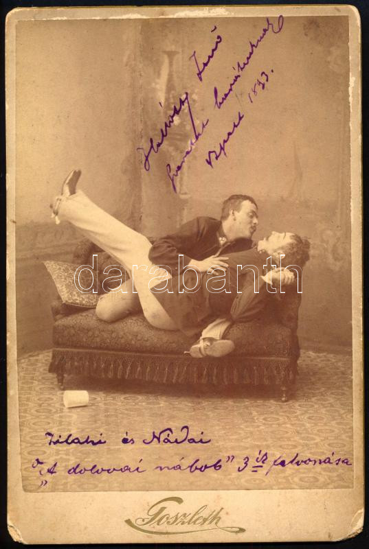 1893 Herczeg Ferencz A dolovai nábob leánya c. darabjának ősbemutatója, Zilahi és Nádai színészek humoros jelenete ajándékozási felirattal. Kabinetfotó 11x17 cm