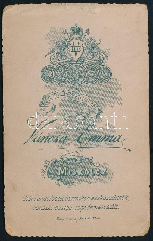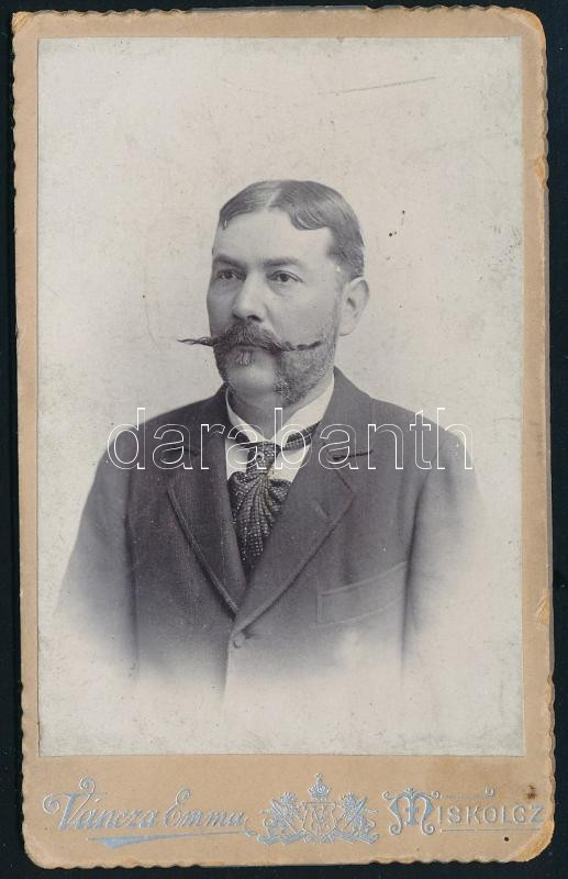 cca 1890 Elegáns, kackiás bajszú férfi portréja, vizitkártya Váncza Emma miskolci műterméből, 10,5x6,5 cm
