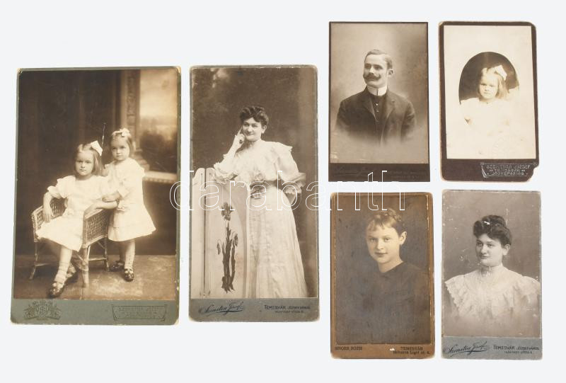 cca 1900 6 db keményhátú kabinetfotó és vizitkártya portré Szenetra József temesvári műterméből, kopásnyomokkal,