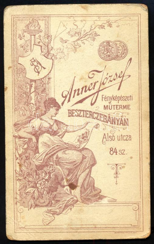 cca 1900 Kislány babával, keményhátú fotó Anner József besztercebányai műterméből, kopásnyomokkal, 10,5×6,5 cm / Banská Bystrica, vintage photo with faults