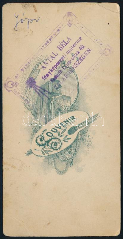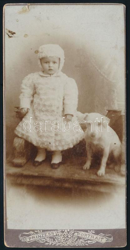 cca 1900 Kislány kutyával, keményhátú fotó ("Prinzess Portrait") Antal Béla zalaegerszegi műterméből, a hátoldalon pecséttel jelzett, egyik sarkán sérült, 16,5x8 cm