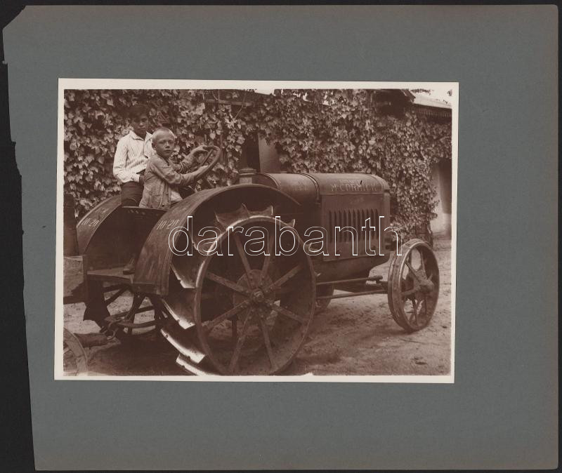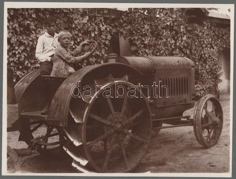 cca 1910-1920, Gyerekek McCormick traktorral, későbbi előhívás - nagyítás (cca 1920-1930), fotó kartonon, 24x18 cm