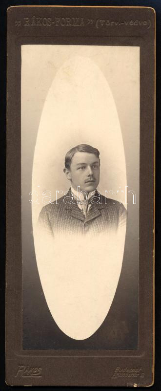 cca 1910 Férfiportré, keményhátú fotó Rákos (Rákos-forma) budapesti műterméből, 18×7 cm