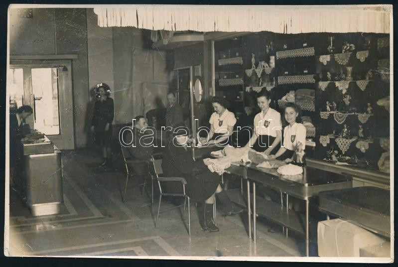 cca 1938 A budapesti Kossuth Lajos utcai ajándékbolt belsejében készített fotó porcelán figurákkal, hátoldalon felirattal és "Foto Orelly" pecséttel, kis javításokkal, 11×17 cm