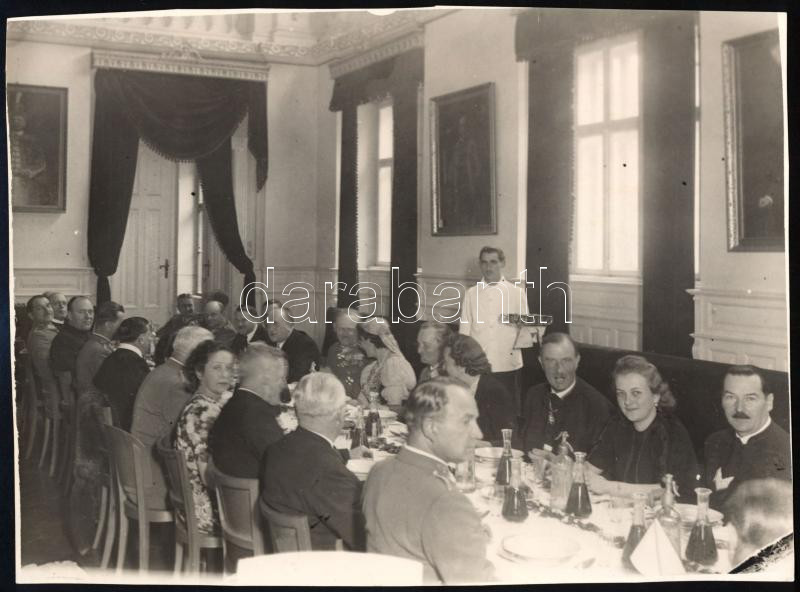 cca 1940 Díszebéd előkelő társasággal, a képen szereplők között vitéz Miklós Béla (1890-1948) altábornagy, 1942-től a kolozsvári hadtest parancsnoka, 1944-ben a magyar 1. hadsereg parancsnoka, 1944. dec. 22. és 1945. nov. 15. között az Ideiglenes Nemzeti Kormány élén Magyarország miniszterelnöke; gróf Bethlen Béla (1888-1979), Szolnok-Doboka és Beszterce-Naszód vármegyék főispánja, 1944 szeptember-októberében a visszatért Észak-Erdély kormánybiztosa, aranysarkantyús lovag; valamint K. Weress Jenő, Dés polgármestere. Nagyméretű fotó, a hátoldalon pecséttel jelzett (Musztea György fotóriporter felvétele), 17x23 cm