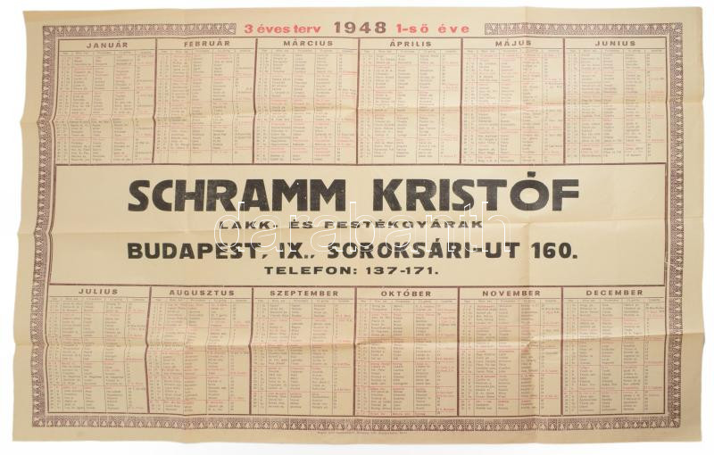 1948 Schramm Kristóf Lakk- és Festékgyárak reklám falinaptár, 49,5x68,5 cm