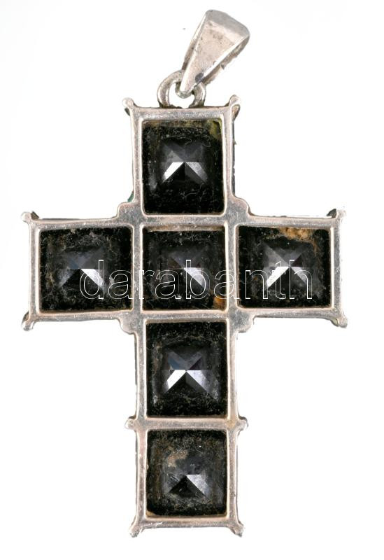 Ezüst (Ag) kereszt hematittal, jelzett, 4,5×3 cm, bruttó: 16,2 g