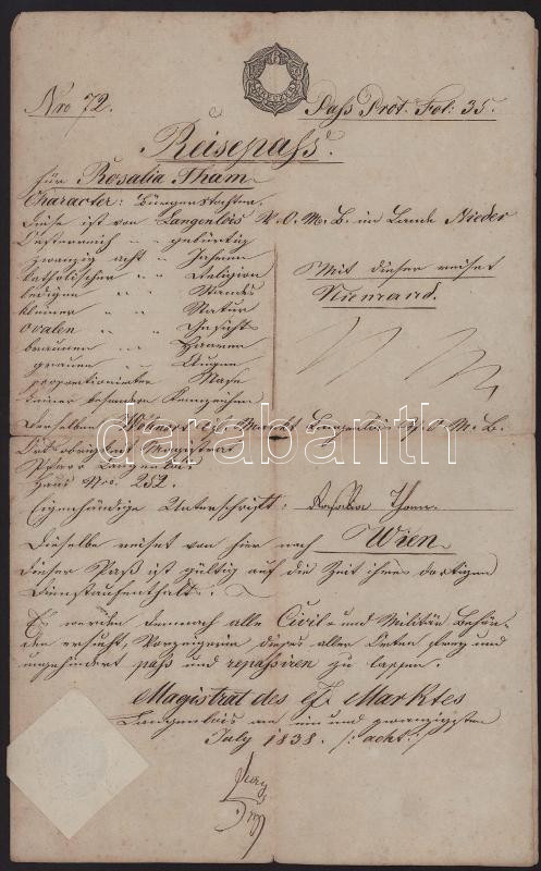 1838 Osztrák útlevél (Reisepass) 6kr szignettával, papírfelzetes viaszpecséttel, kissé sérült