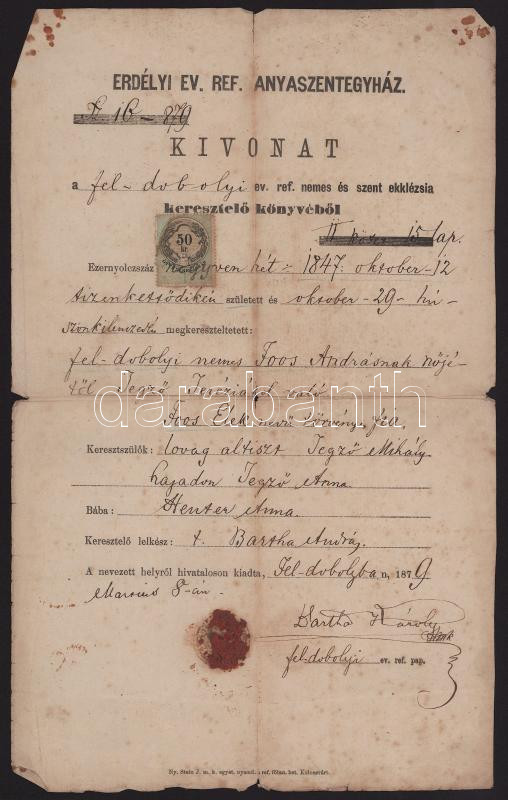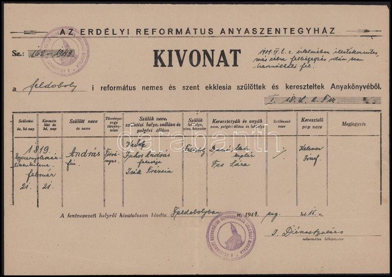 1879-1943 Feldoboly (Dobolii de Sus), Erdélyi Református Anyaszentegyház által kiállított 2 db anyakönyvi kivonat + illetékességi (illetőségi) bizonyítvány