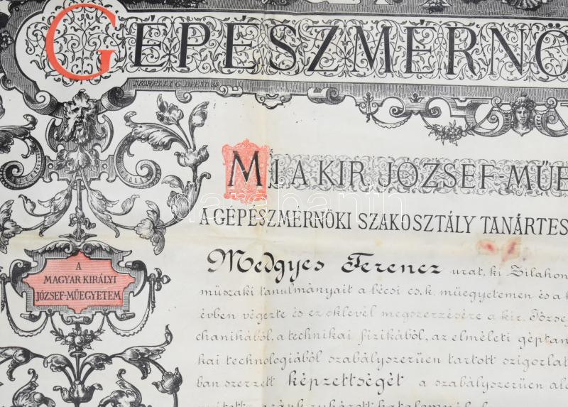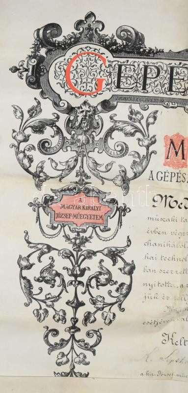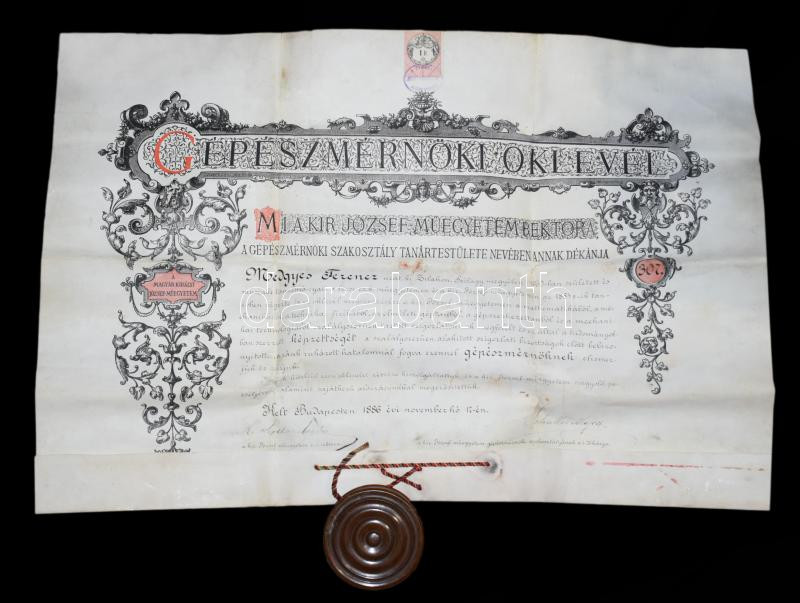 1886 Gépészmérnöki diploma. Lipthay és Saller tanárok aláírásaival. Pergamen, függő viasz pecséttel.