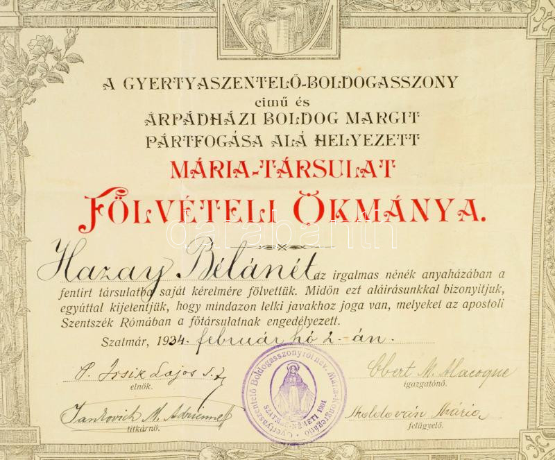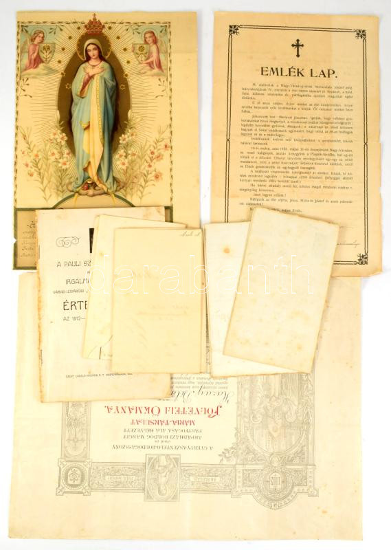 1908-1915 Nagyvárad, a pauli Szent Vincéről nevezett irgalmas nővérek várad-újvárosi ,,Immaculata"-intézetének értesítője az 1912-13. iskolai évről + 9 db iskolai bizonyítvány, mind Mertz Margit névre + emléklap az osztály tanulóinak aláírásaival + 1934-1938 Szatmárnémeti, 2 db felvételi okmány