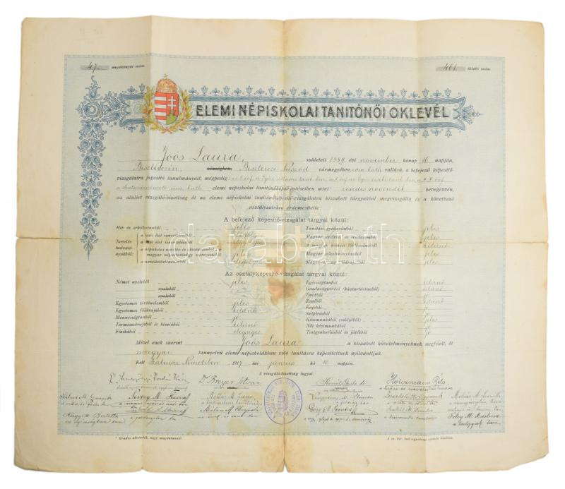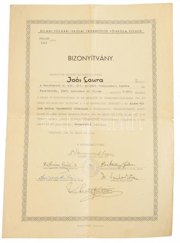 1917 Szatmárnémeti (Satu Mare), elemi népiskolai tanítónői oklevél, rajta Szentgyörgyi Jordán Károly (1849-1927) kanonok, pápai prelátus, címzetes apát, Breyer István (1880-1940) országgyűlési képviselő, miniszteri biztos, későbbi győri püspök és mások aláírásával, sérülésekkel, foltokkal, 39,5x49 cm + 1941 Szeged, Állami Polgári Iskolai Tanárképző Főiskola által kiállított bizonyítvány, aláírásokkal