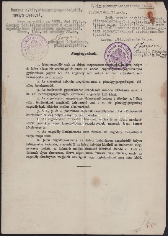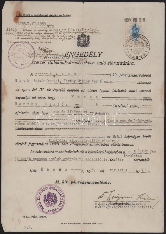 1939 Kassa italmérési engedély