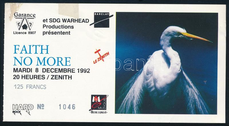 1992 Faith No More koncertjegy, Paris, Le Zenith, 8. Decembre 1992, No. 1046.