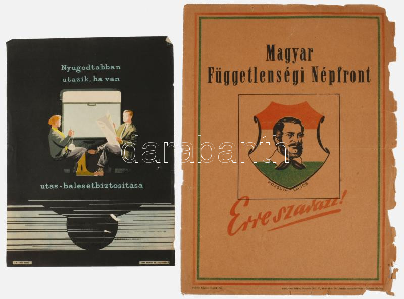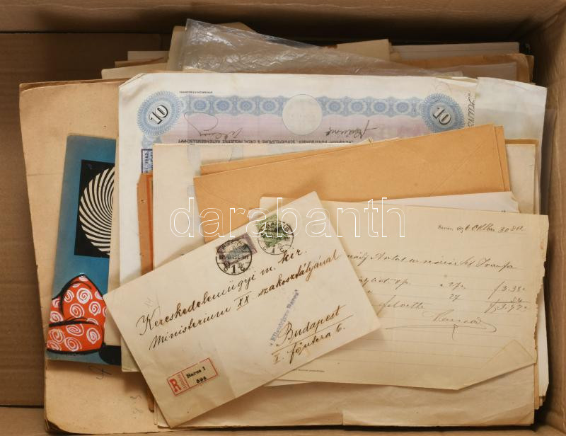 Vegyes papírrégiség tétel, közte XIX. századi számlák, plakátok, borítékok, reklámszatyrok, Gádor István könyv, bélyegek, stb.