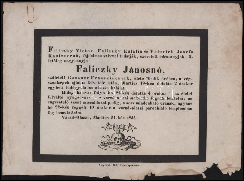 1855 Váradolaszi (Nagyvárad), "Faliczky Jánosnő", szül. Gaszner Franciska (1785-1855) színműíró, műfordító halotti értesítője, lapszéli sérüléssel, kissé foltos, 20x27,5 cm