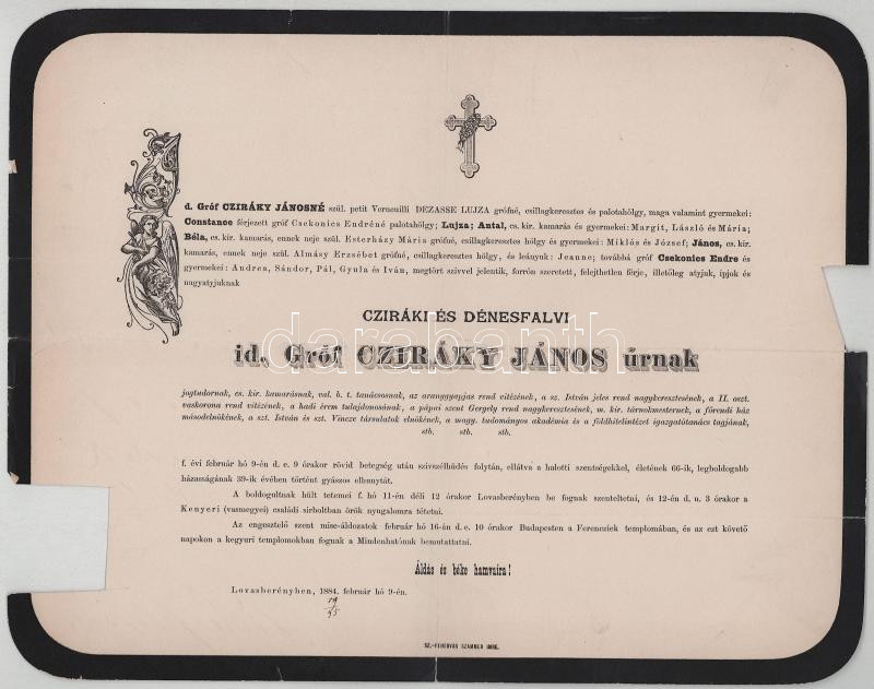 1884 Lovasberény, id. cziráki és dénesfalvi gróf Cziráky János (1818-1884) cs. és kir. kamarás, valóságos belső titkos tanácsos, az Aranygyapjas rend lovagja, a Szent István Társulat elnöke halotti értesítője, kisebb lapszéli sérülésekkel, hiánnyal, 23x29 cm