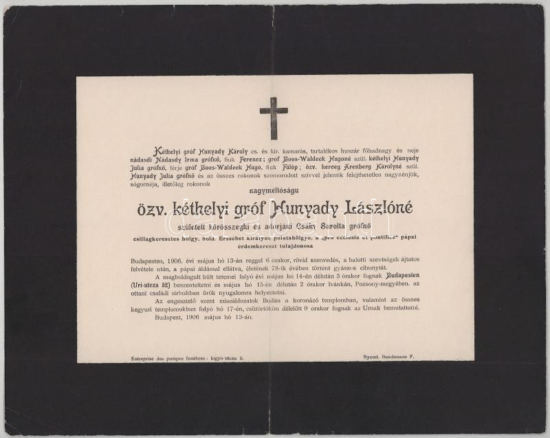 1906 Bp., özv. kéthelyi gróf Hunyady Lászlóné, szül. kőrösszegi és adorjáni Csáky Sarolta (1828-1906) cs. és kir. palotahölgy, csillagkeresztes hölgy, a "Pro Ecclesia et Pontifice" pápai érdemkereszt tulajdonosa halotti értesítője, kis lapszéli sérülésekkel, 24x30,5 cm