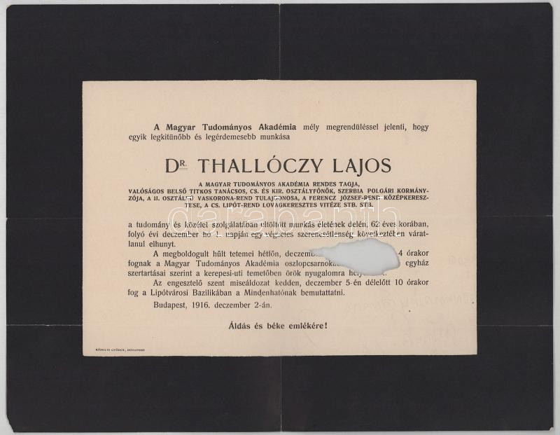 1916 Bp., Thallóczy Lajos (1857-1916), az MTA tagja, valóságos belső titkos tanácsos, cs. és kir. osztályfőnök, Szerbia polgári kormányzója halotti értesítője, sérült, 23x29,5 cm