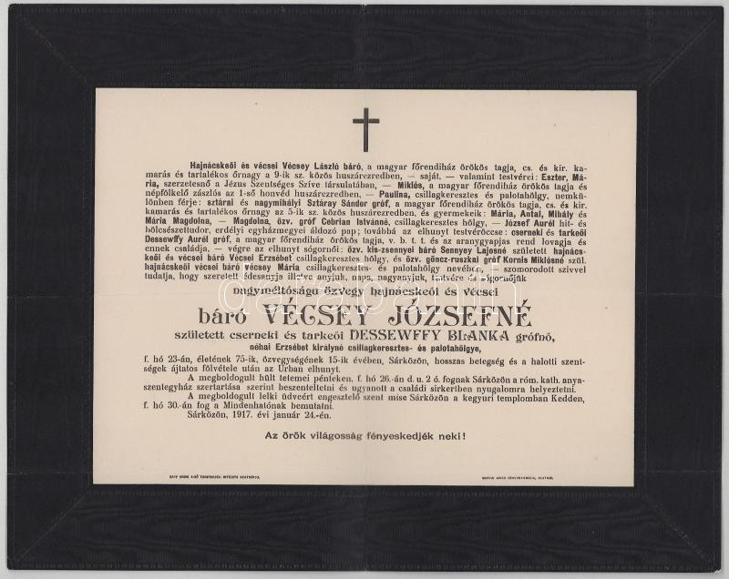 1917 Sárköz, báró Vécsey Józsefné, szül. cserneki és tarkeői gróf Dessewffy Blanka (1842-1917) cs. és kir. palotahölgy, csillagkeresztes hölgy halotti értesítője, 23x29 cm