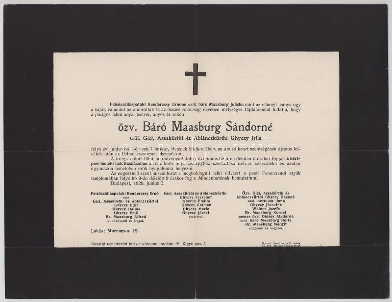 1929 Bp., özv. báró Maasburg Sándorné, szül. giczi, assa- és ablanczkürthi Ghyczy Ilona (Jella) (1870-1929) halotti értesítője, 23x30 cm