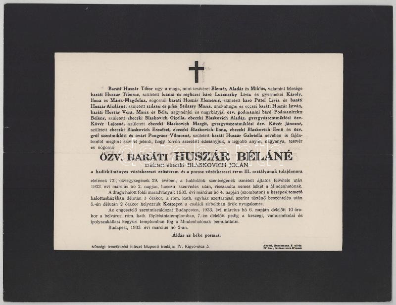1933 Bp., özv. baráti Huszár Béláné, szül. ebecki Blaskovich Jolán (1861-1933), a hadiékítményes vöröskereszt ezüstérem és a porosz vöröskereszt érem tulajdonosa halotti értesítője, 23x30 cm