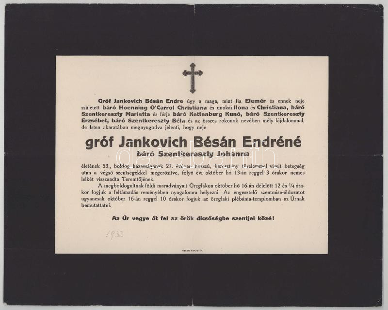 1933 gróf Jankovich-Bésán Endréné, szül. báró Szentkereszty Johanna (Janka) (1880-1933) halotti értesítője, kis lapszéli sérülésekkel, 24,5x30,5 cm