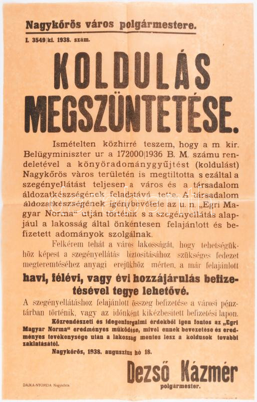 1938 Nagykőrös a koldulás betiltásáról szóló rendelet falragasz 32x37 cm