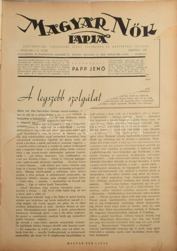 1939 A Magyar Nők Lapja vegyes számai könyvbe kötve, sérüléssel, kopottas állapotban.
