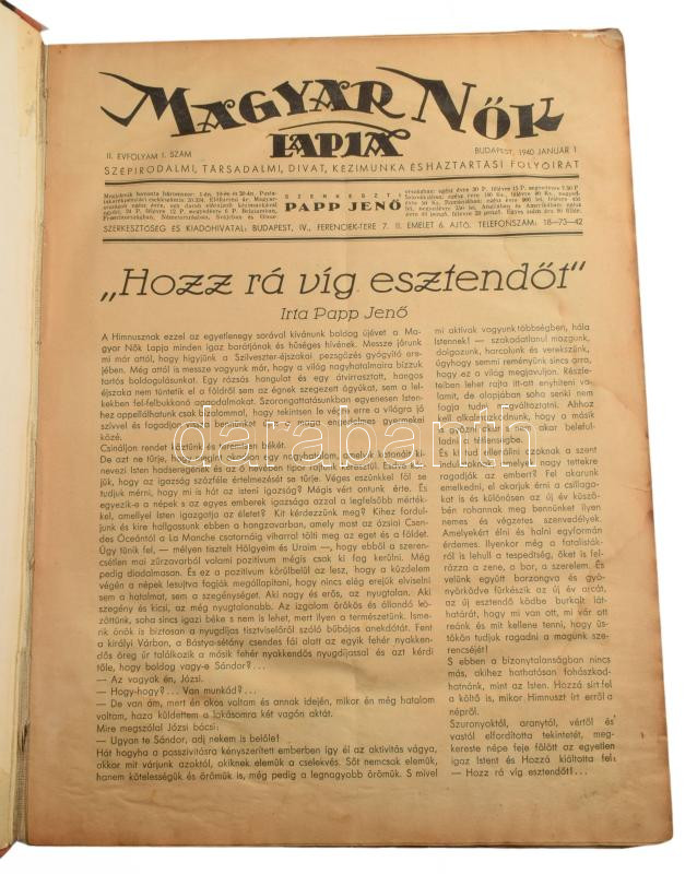 1940 A Magyar Nők Lapja vegyes számai könyvbe kötve, kopottas állapotban.