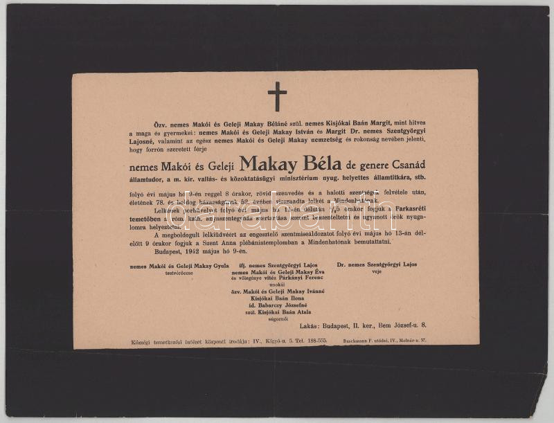 1942 Bp., makói és geleji Makay Béla (1863-1942) államtudor, vallás- és közoktatásügyi helyettes államtitkár halotti értesítője, kis sarokhiánnyal, 23x30 cm