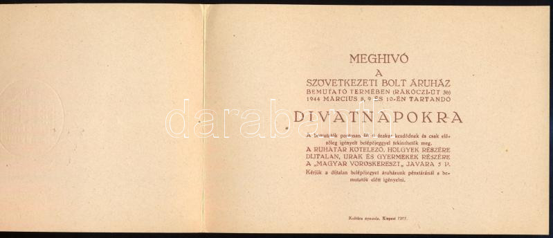 1944 Meghívó a Szövetkezeti Bolt Áruház bemutatótermében tartott divatnapokra
