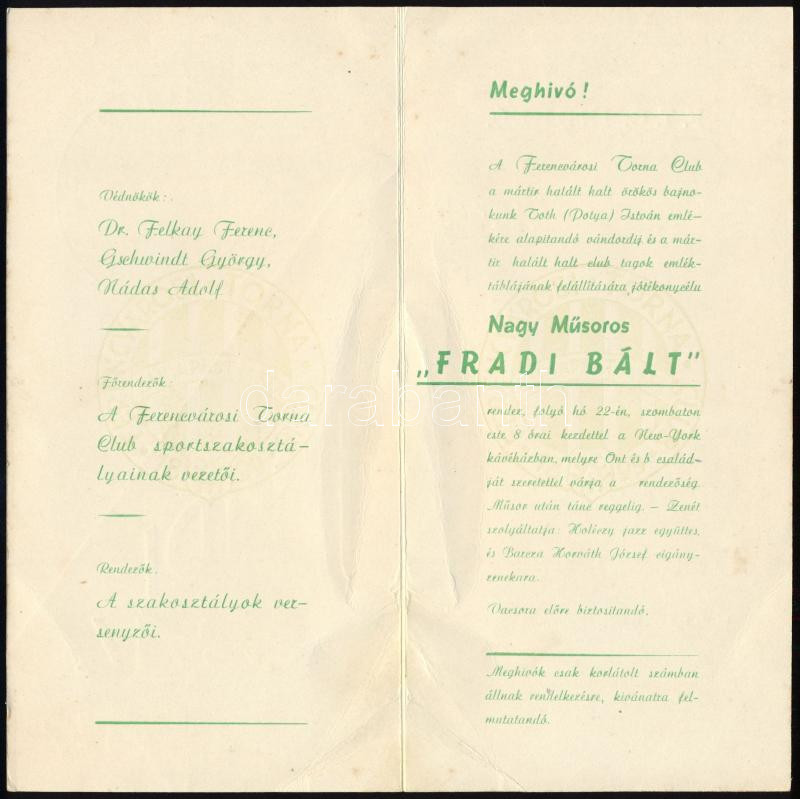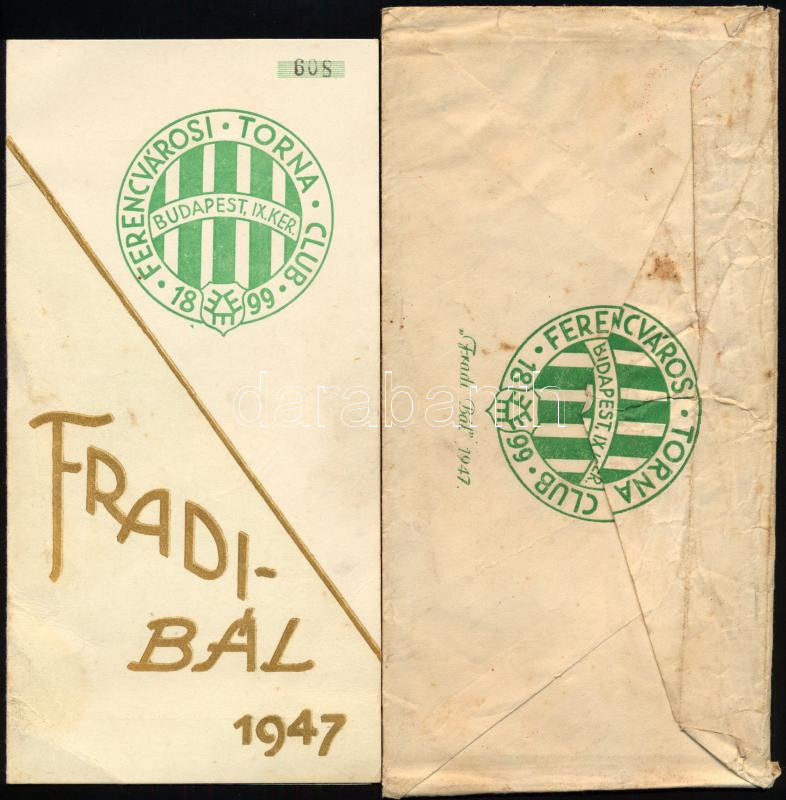 1947 ,,Fradi Bál" (FTC) meghívója, sorszámozott, eredeti, kissé viseltes borítékkal